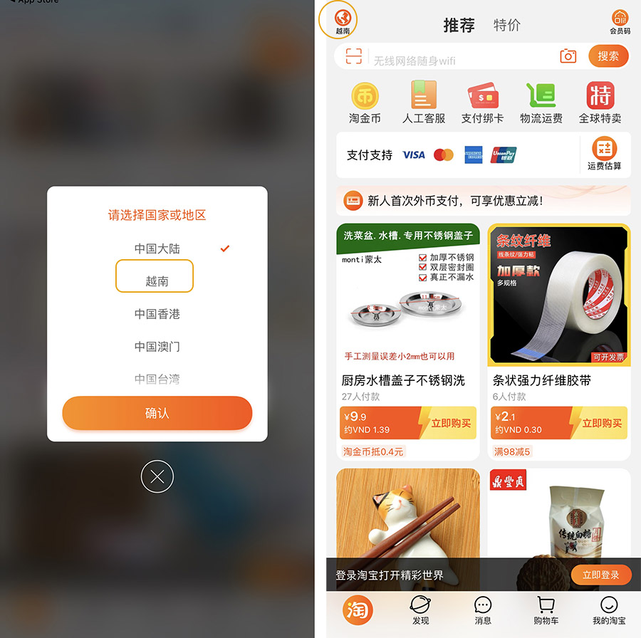 Trong màn hình chính của ứng dụng, bạn để ý phía góc trên bên trái có biểu tượng trái đất, click vào và chọn dòng “越南” để chọn khu vực là Việt Nam, điều này có nghĩa là hoàn toàn có thể đặt hàng và taobao hỗ trợ ship về Việt Nam.