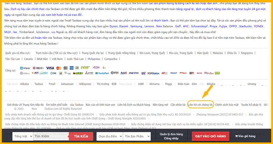 Đổi ngôn ngữ trên Taobao sang tiếng Việt và tìm tới phần chân trang web, sẽ có phần “liên hệ với chúng tôi” bạn click vào để mở trang hỗ trợ.
