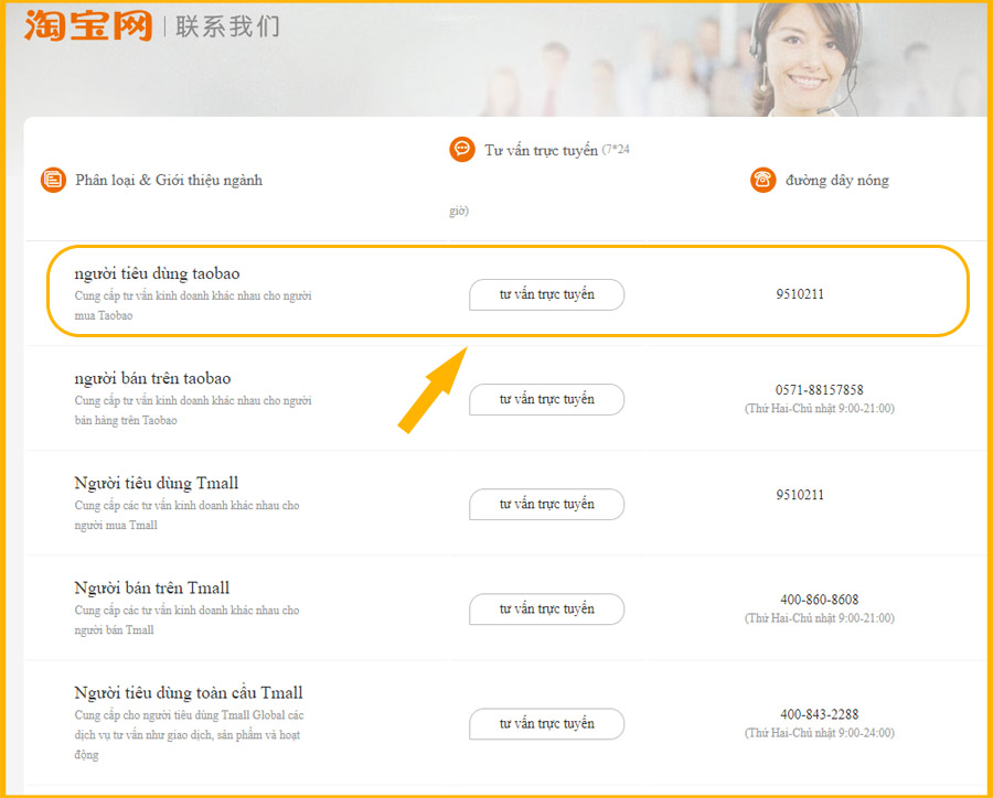 Bước tiếp theo chọn dòng đầu tiên “người tiêu dùng Taobao” -> “ Tư vấn trực tuyến” để mở hộp thoại chat trên Taobao, lưu ý cần sử dụng ngôn ngữ tiếng Trung để trao đổi với Taobao.