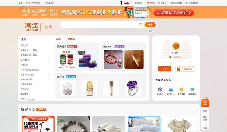 Bước 1: Sau khi đăng nhập vào hệ thống, bạn tìm tới phần quản lý đơn hàng tại menu trên của website, vào phần “Taobao của tôi” -> Sản phẩm đã mua để vào quản lý đơn đặt hàng (bạn làm theo hướng dẫn trên ảnh), sử dụng công cụ dịch vủa trình duyệt để đổi ngôn ngữ Taobao sang tiếng Việt.
