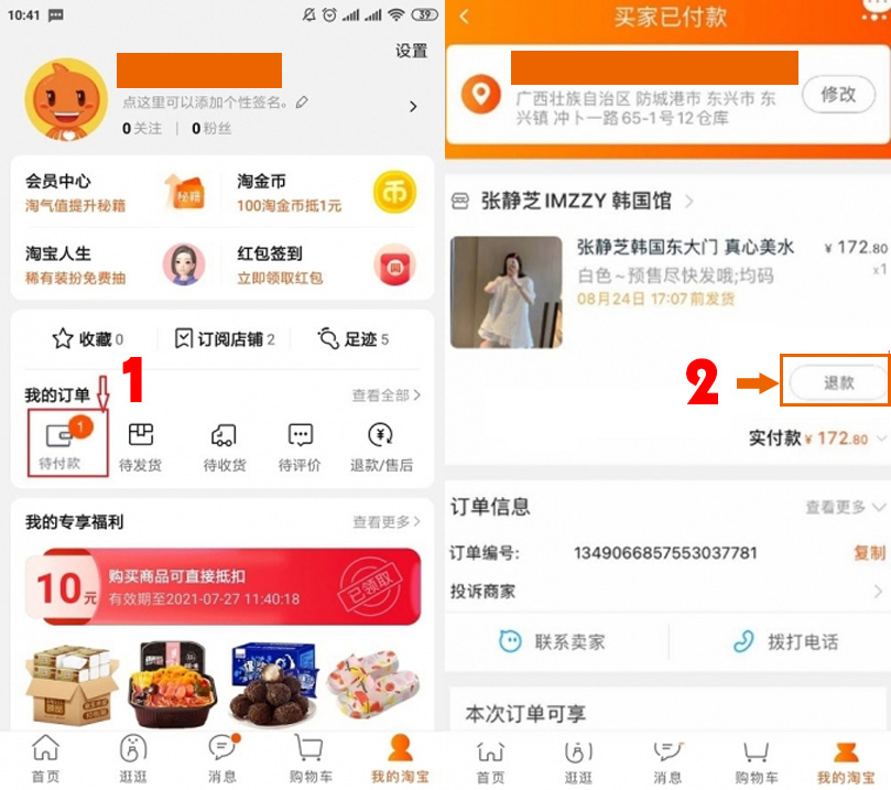 Bước 2: Bên cạnh mỗi sản phẩm đã đặt mua luôn có lựa chọn hoàn trả (hủy đơn), bạn chọn “退款” và tiếp tục phần nhập các yêu cầu từ hệ thống.