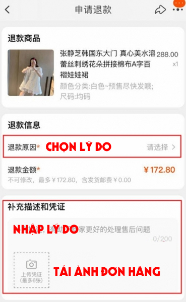 Bước tiếp theo trong danh sách đơn hàng đã mua, bạn chọn chức năng “退款” tạo sản phẩm đó, sau đó nhập các thông tin như hệ thống yêu cầu bao gồm lý do hủy đơn, tải một số hình ảnh đơn hàng lên và gửi yêu cầu đi.