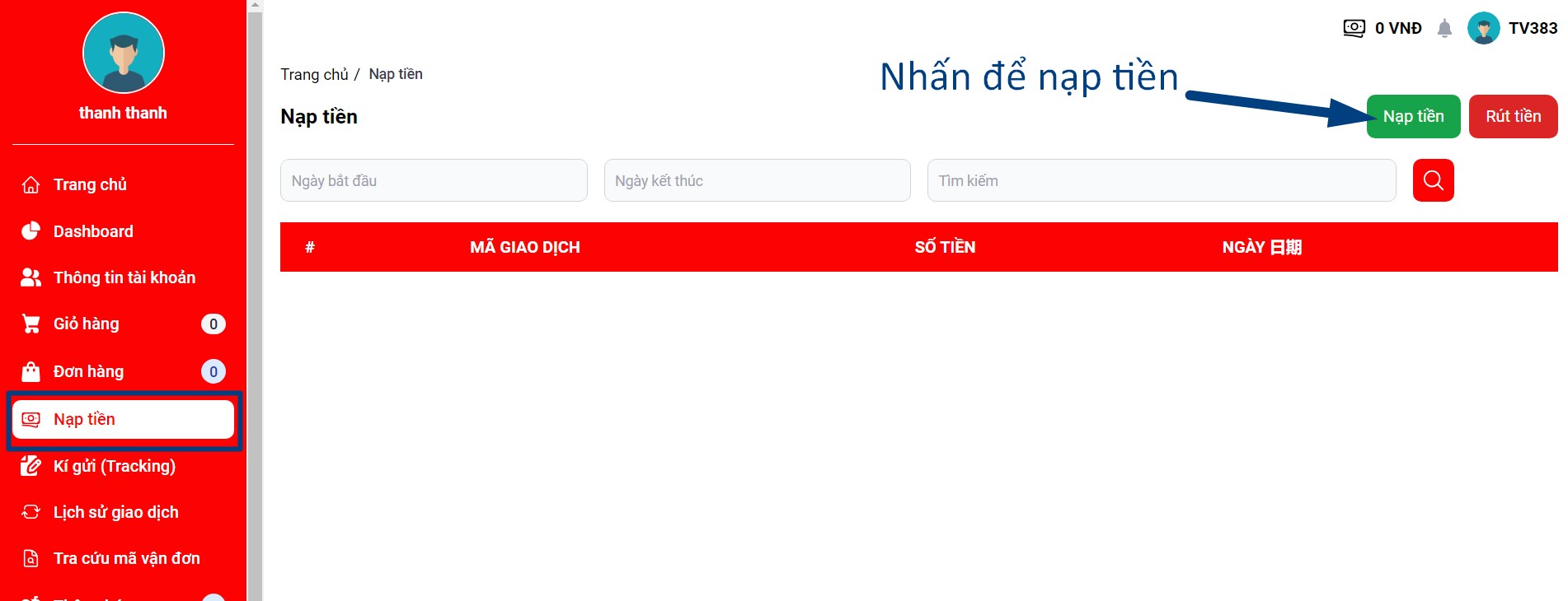 Bước 2: Tại trang thành viên, chọn mục "Nạp tiền", nhấn "Nạp tiền"